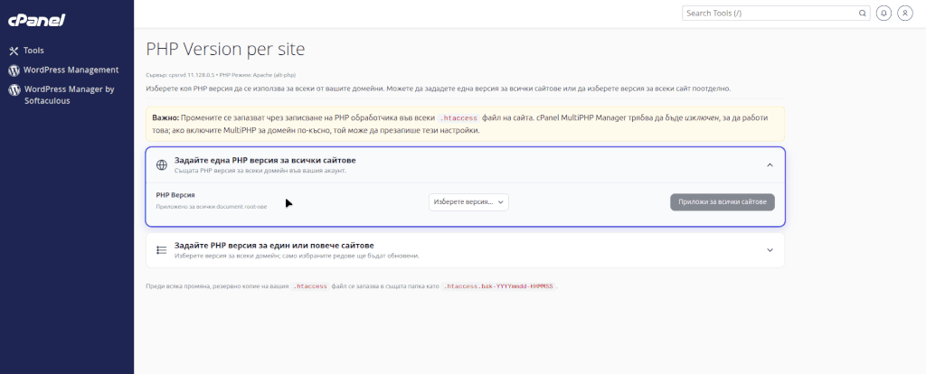Както самото наименование подсказва, то от тази опция може да промените версията за целият Ви хостинг акаунт. Това е удобно, ако имате един сайт или множество такива, които използват една PHP версия.