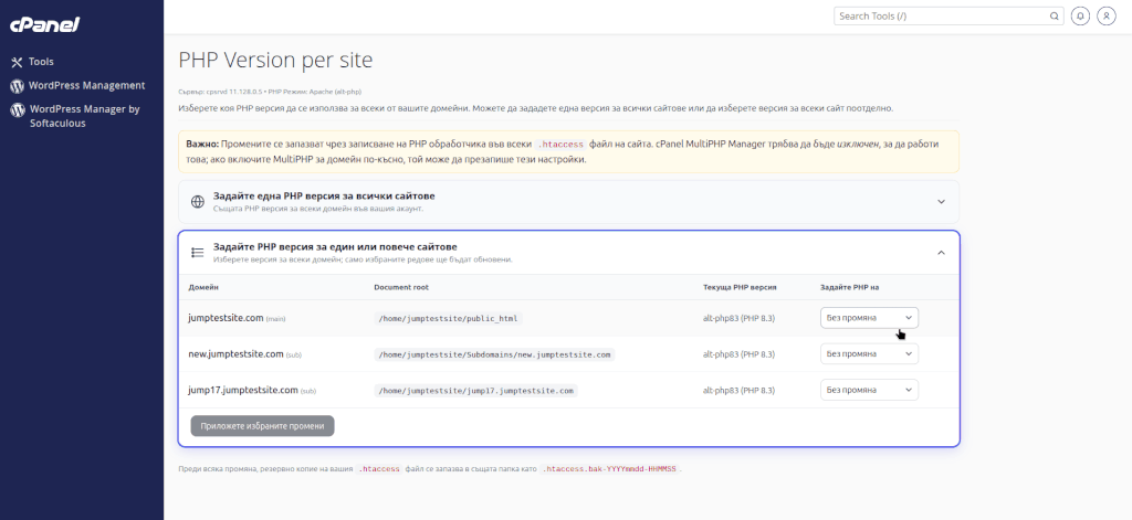 Подобрената функционалност за PHP смяна на версията, в рамките на хостинг акаунта в Jump.BG дава възможност да смените версията на един или няколко сайта с няколко клика в cPanel: