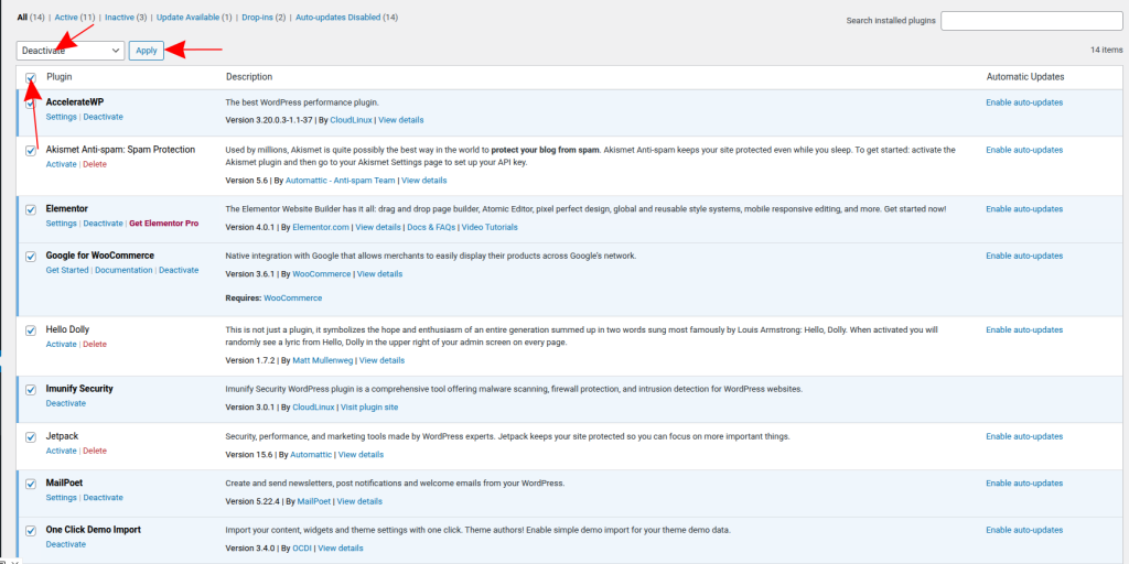 - Маркирайте всички плъгини чрез отметката най-горе в списъка.