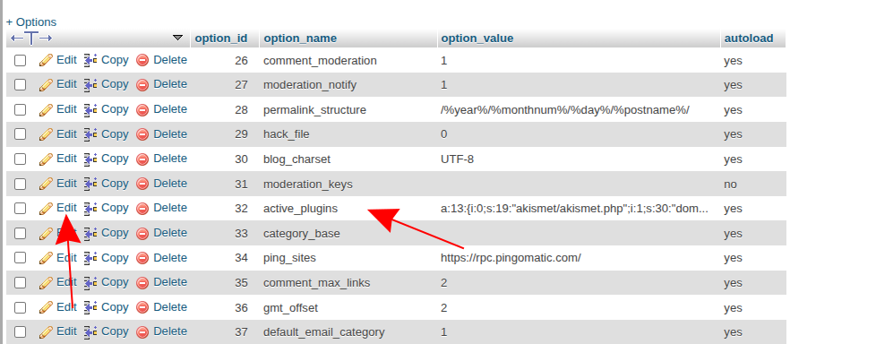 В таблицата *_options намерете реда с option_name = active_plugins. Това е мястото, където WordPress пази списъка с активни плъгини за сайта.