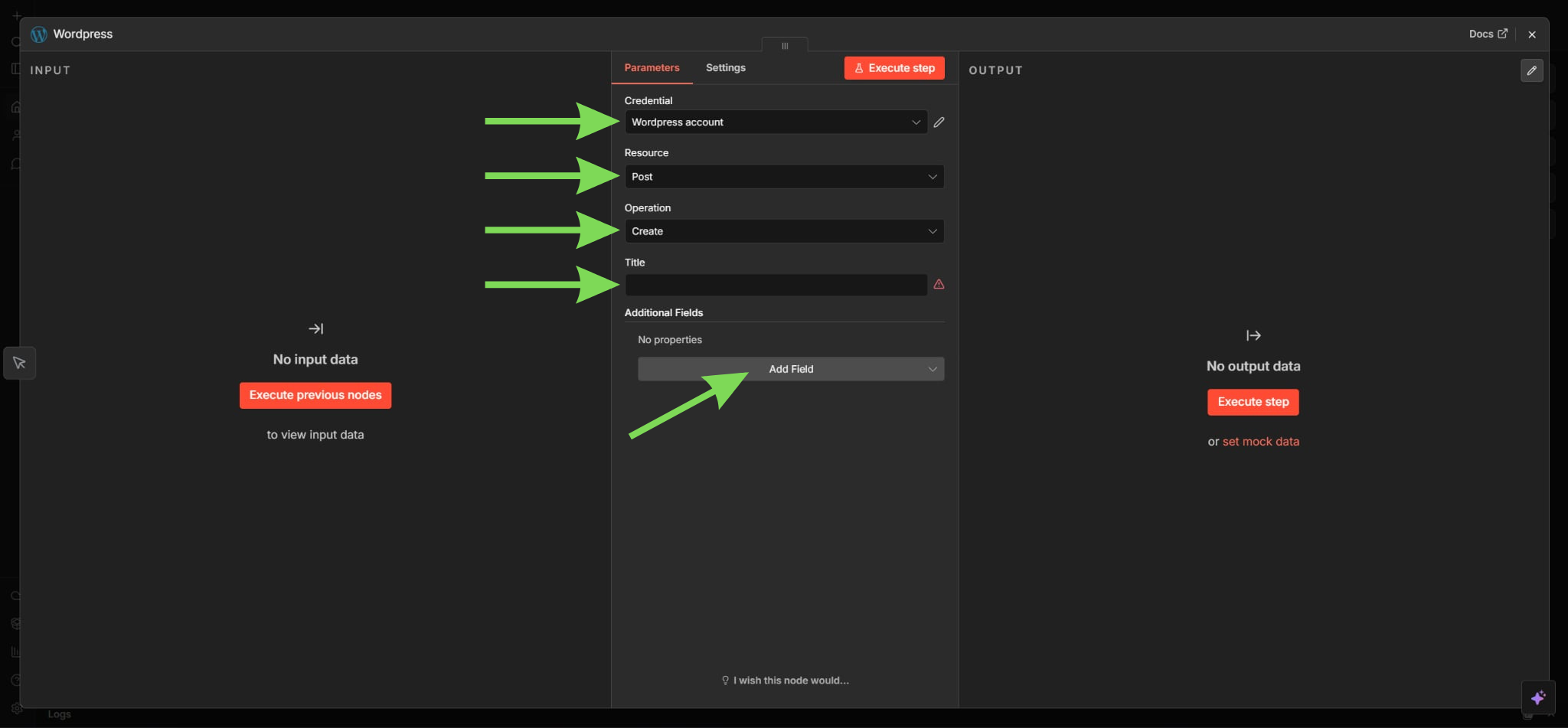 Стъпка 4: Добавете данните си за вход в WordPress в n8n