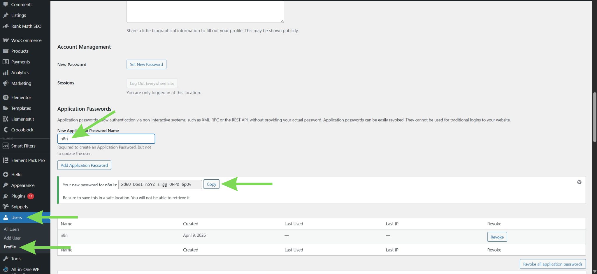 Кликнете върху потребителския си профил, превъртете надолу до раздела Application Passwords, въведете „n8n“ като име и генерирайте паролата. Трябва да имате предвид, че ако използвате security плъгин като Wordfence, генерирането на Application Passwords може да е блокирано по подразбиране. В този случай трябва първо да разрешите тази функция от настройките на плъгина, преди да продължите. Тази парола се използва за сигурна API автентификация през HTTPS и е препоръчителният метод за свързване на n8n с WordPress.