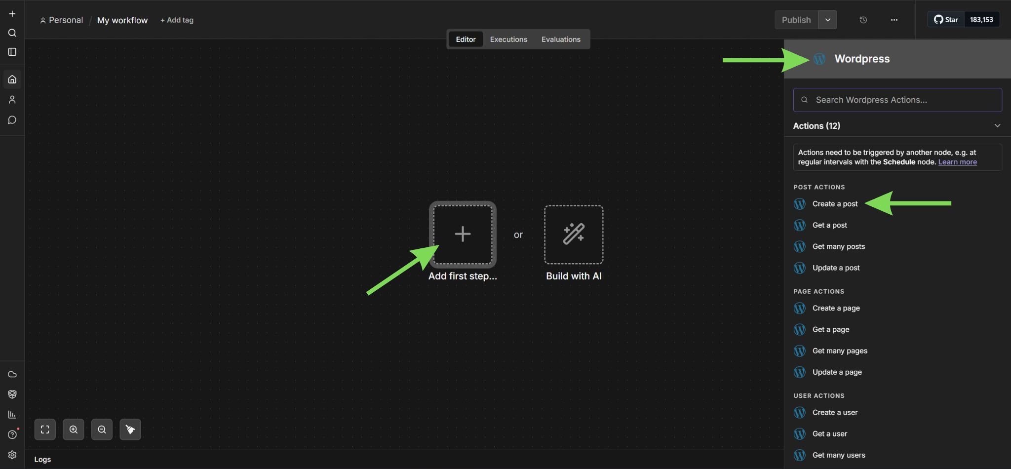 Отворете панела за управление на n8n и създайте нов workflow, за да започнете настройката. Тук ще бъде изградена и управлявана вашата автоматизация. След като влезете в редактора, потърсете нодът на WordPress от контролния панел.