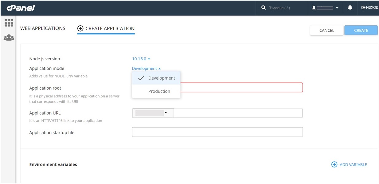 Създаването на нова виртуална среда Node.js се извършва посредством бутона “Create Application” във вашия cPanel.