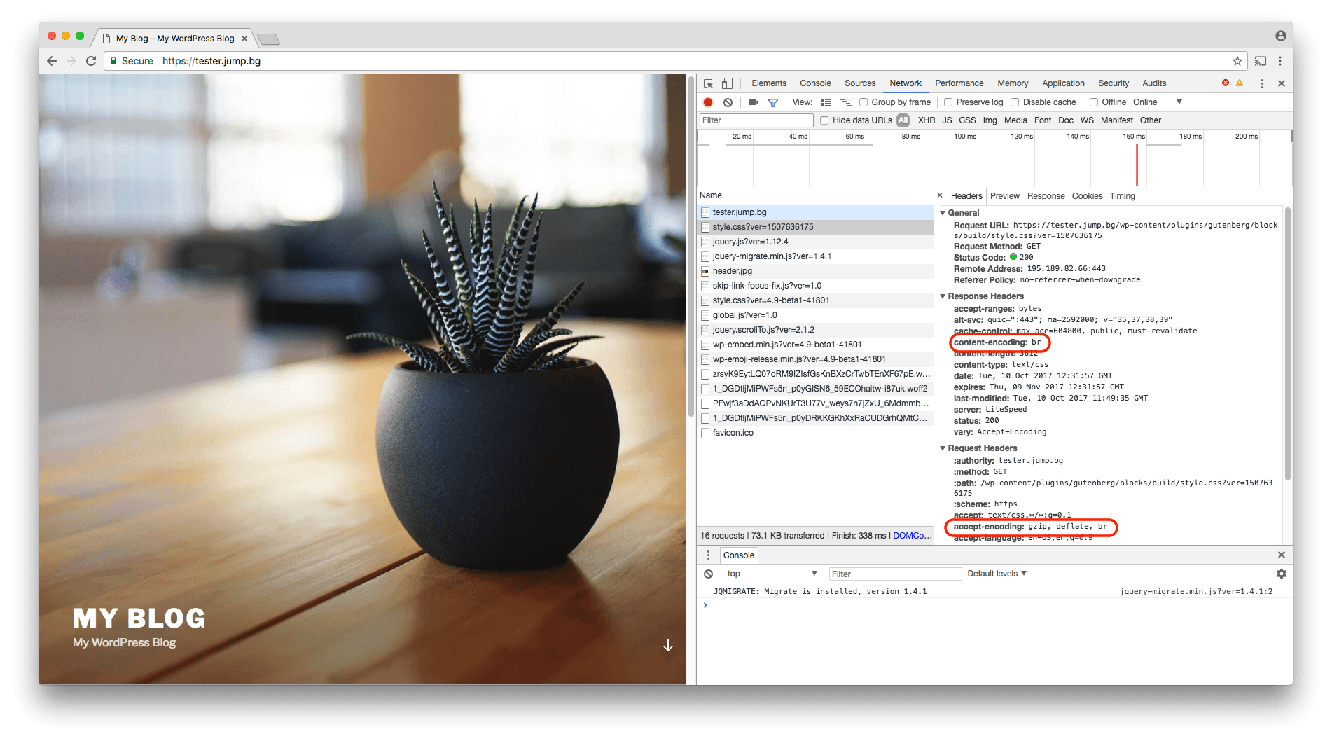 И сега една лоша новина - Brotli е активиран само и единственно на потребители, чиито сайтове се зареждат през сигурна връзка (HTTPS). Което всъщност, заедно с QUIC, е може би поредната причина да се мигрира към сигурна връзка, което вече описахме в поредица от статии тук. Заедно с QUIC, Brotli помага на сайтовете под сигурна връзка да се зареждат малко по-бързо. Специално при Brotli, помощта е, че обемът от данни на сайтовете намалява, като при по-тежките и натоварени сайтове обема може да се измерва в мегабайти или дори гигабайти дневно. В Jump Hosting, като оптимален вариант за компресиране, без по-голямо натоварване на сървърите, се компресират с Brotli само статичните файлове, докато динамичните файлове генерирани от PHP, например, се компресират с gzip. Тоест, ако имаме WordPress или друга CMS система, то само HTML файлът ще се компресира с gzip, докато всички JS, CSS и други файлове ще бъдат компресирани с Brotli.