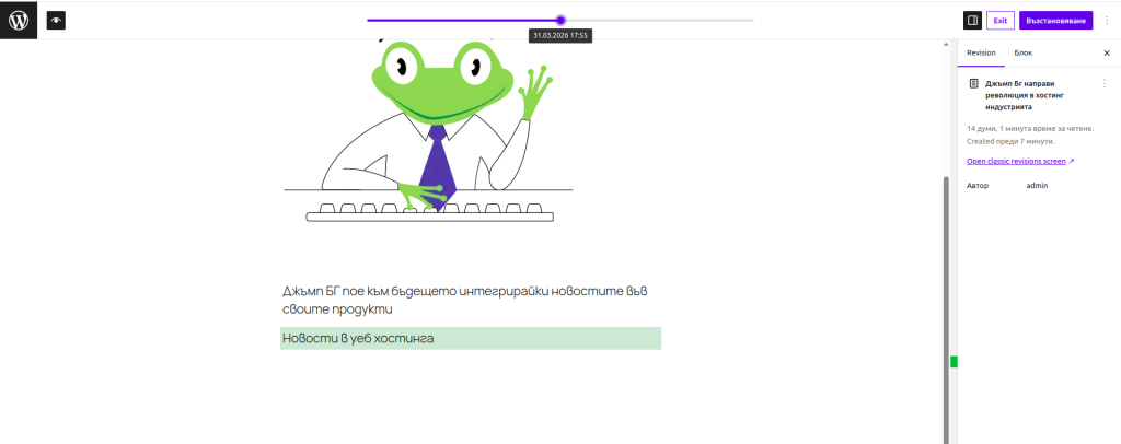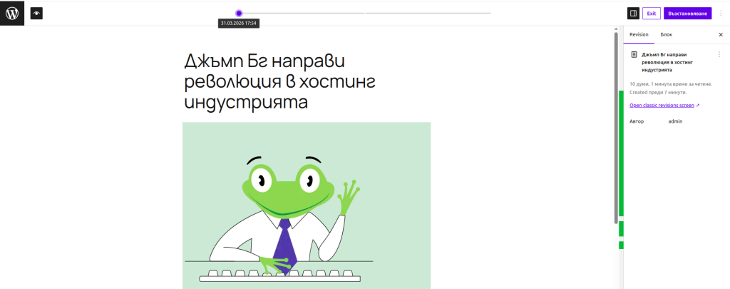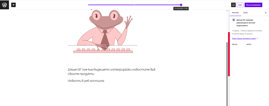 Виждаме, че конкретната страница има 3 ревизии. Когато изберем на тях, вече ще можем да видим как страницата е изглеждала визуално при всяка една от ревизиите:
