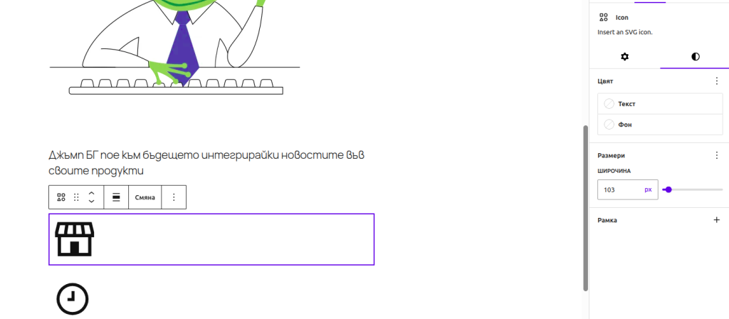Този блок се използва за вмъкване на икони (SVG векторен формат) с регулируем мащаб навсякъде по сайта, без да е необходимо да се прави промяна на кода.