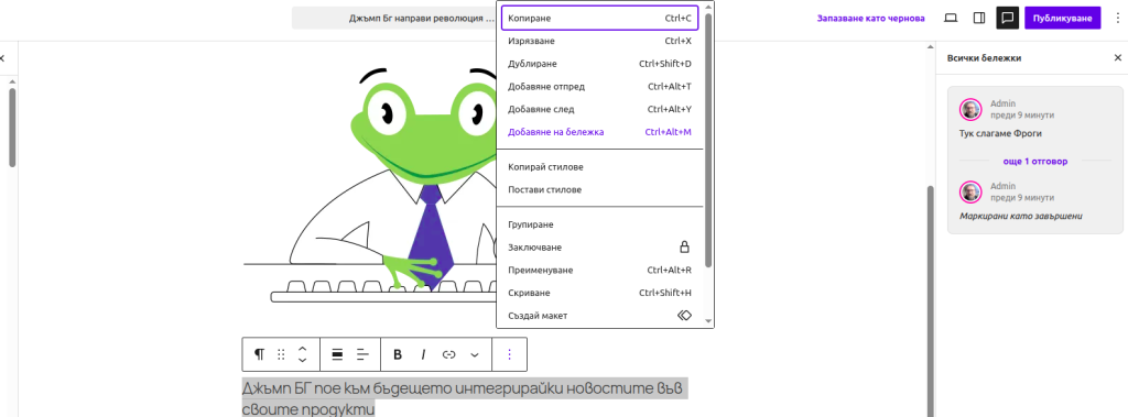 Селектирате даден текст и оставяте бележка на своите колеги как той трябва да бъде променен. Досега бележките се свързваха към целият блок.