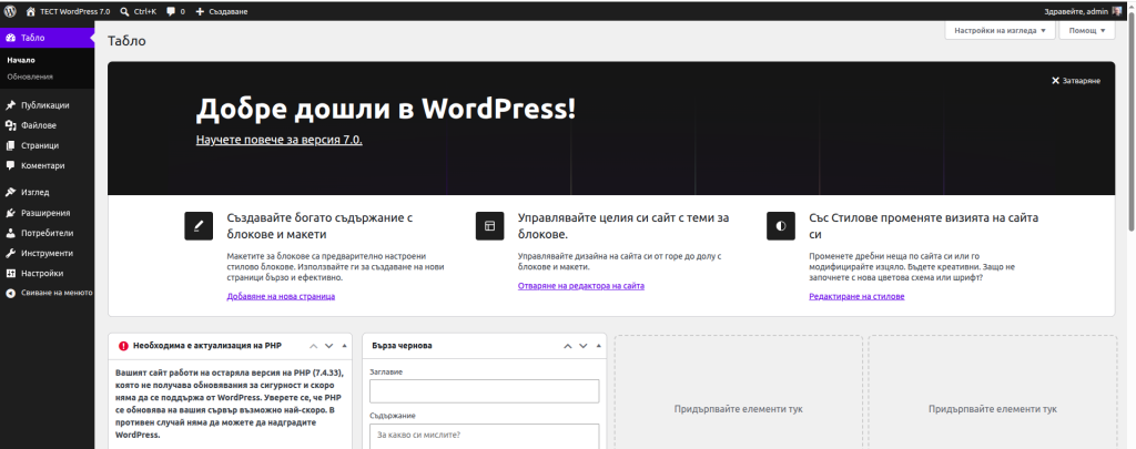 Официално WordPress 7.0 спира поддръжката на версии 7.2. и 7.3 на PHP, като минималната необходима, за да работи платформата е версия 7.4. Ако сайтовете Ви използват тези версии, те ще продължат да работят на WordPress 6.9 и след излизането на версия 7.0 ще има ъпдейти за сигурност, но докато не промените PHP версията на 7.4. няма да можете да използвате новите функционалности на платформата.