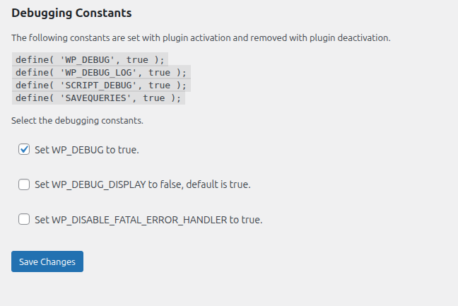 След активиране на плъгина, WordPress debug режимът се включва автоматично. Плъгинът добавя необходимите директиви към wp-config.php файла, без да е необходимо ръчно редактиране.